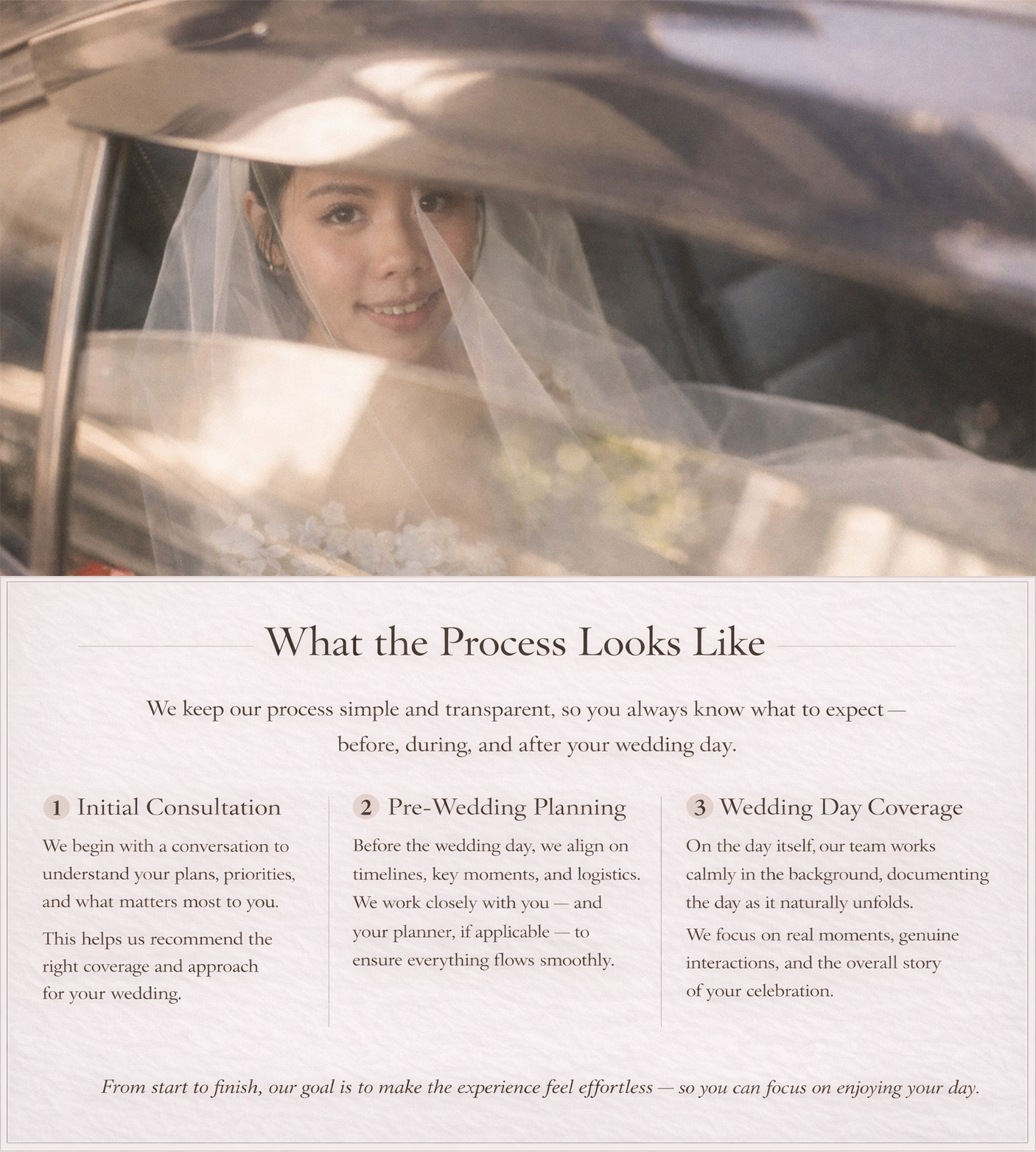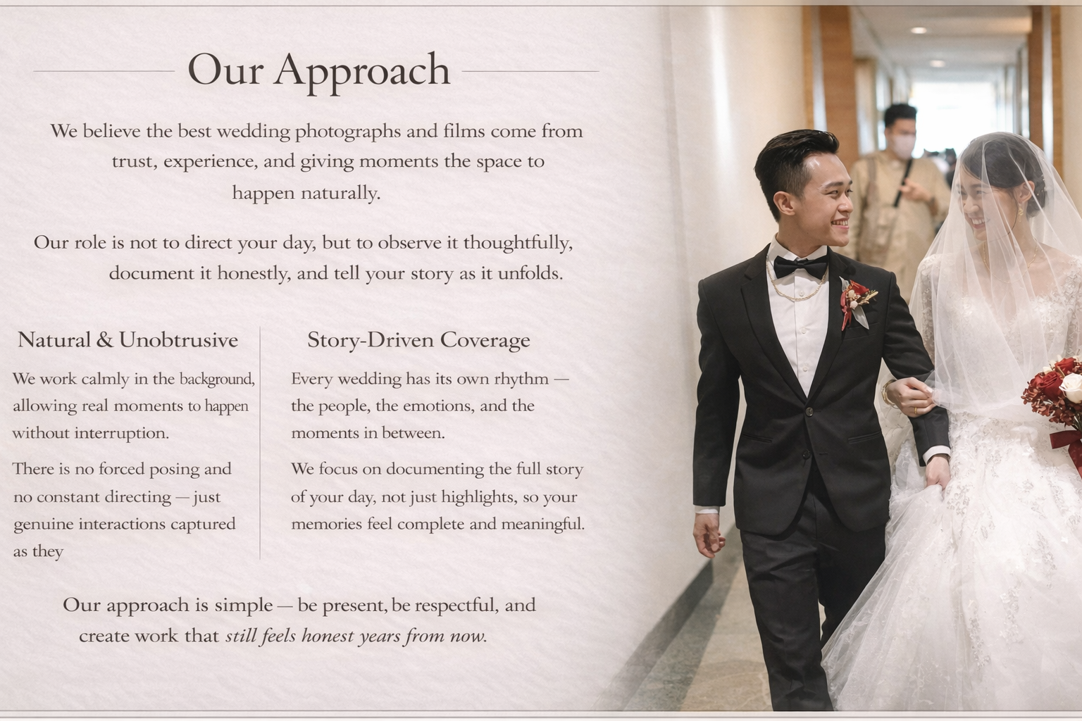 Timeless, romantic, and story-driven, with a natural documentary approach and thoughtful direction.How many professionals will be present on our wedding day?