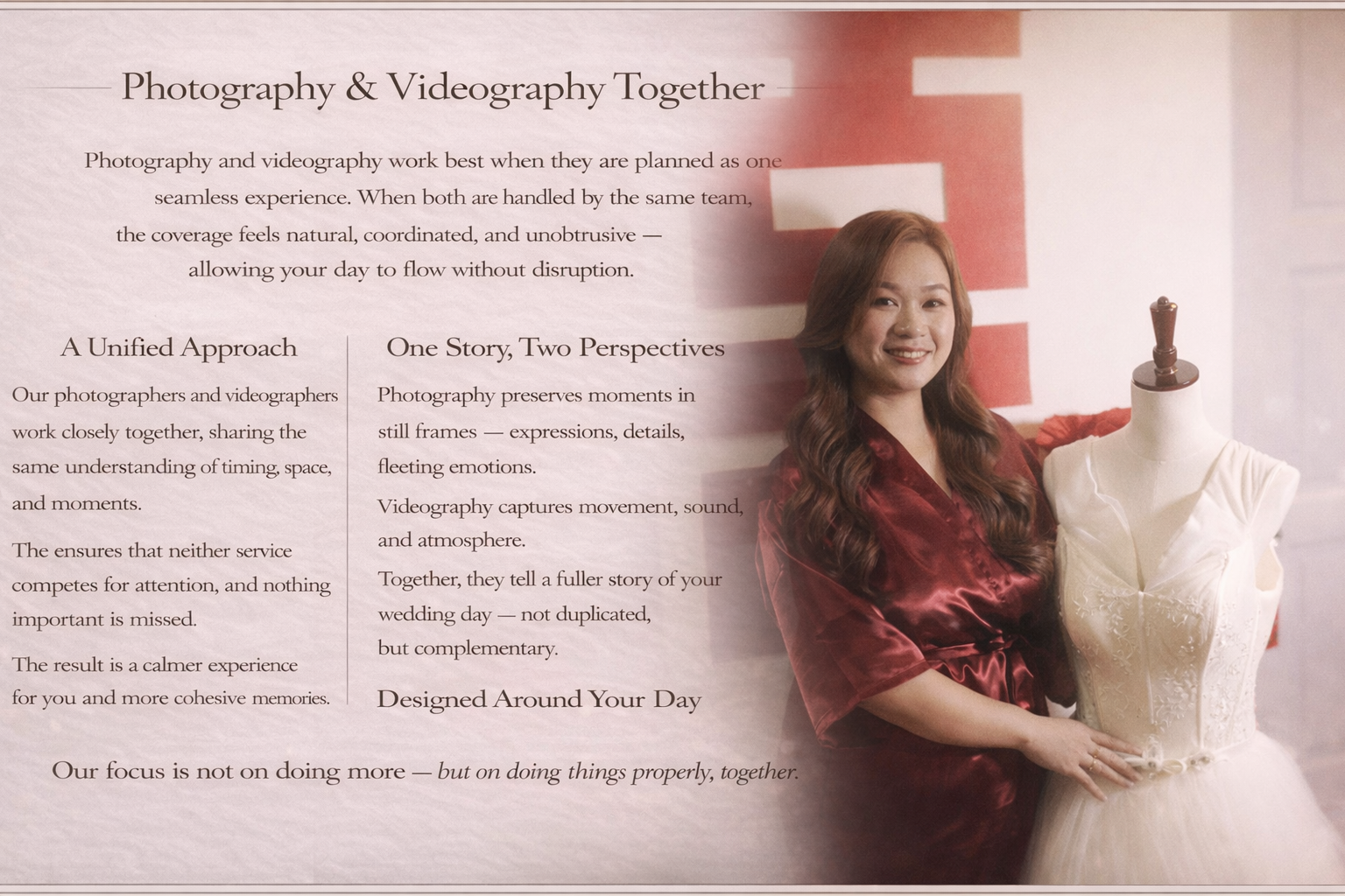 We recommend securing your date 6–12 months in advance, especially for peak wedding periods.Do you offer photography and videography together?